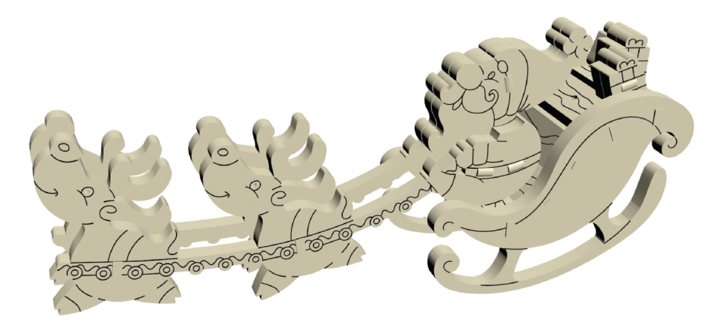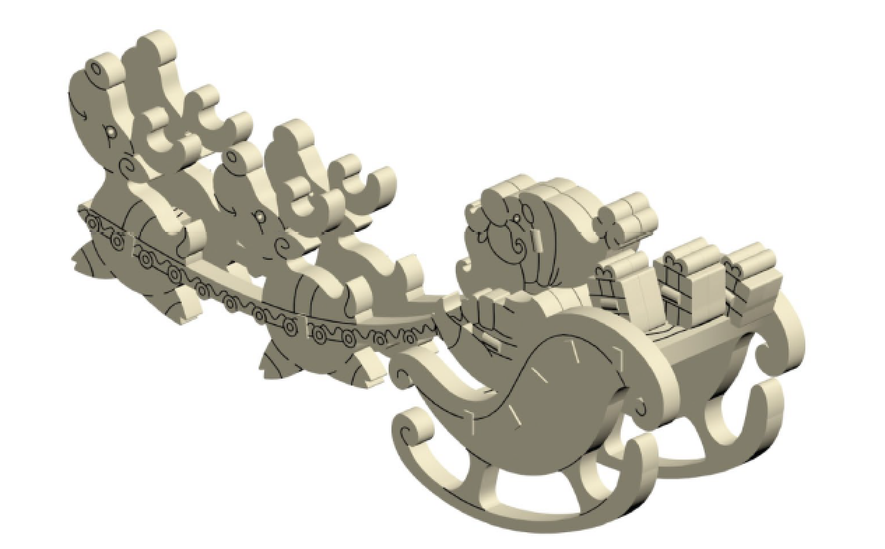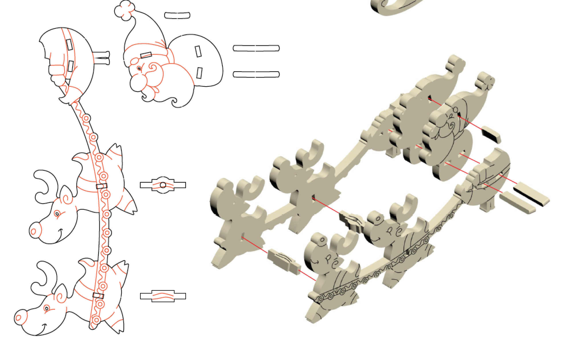 Ci siamo quasi! Bisogna ora assemblare le renne con Babbo Natale. Meglio partire da quest'ultimo, inserendo un elemento lungo su uno dei fianchi e quindi usando un tavolo come battuta per spingere dentro gli altri elementi uno alla volta. I pezzi di congiunzione tra le renne si possono anche mettere dopo.