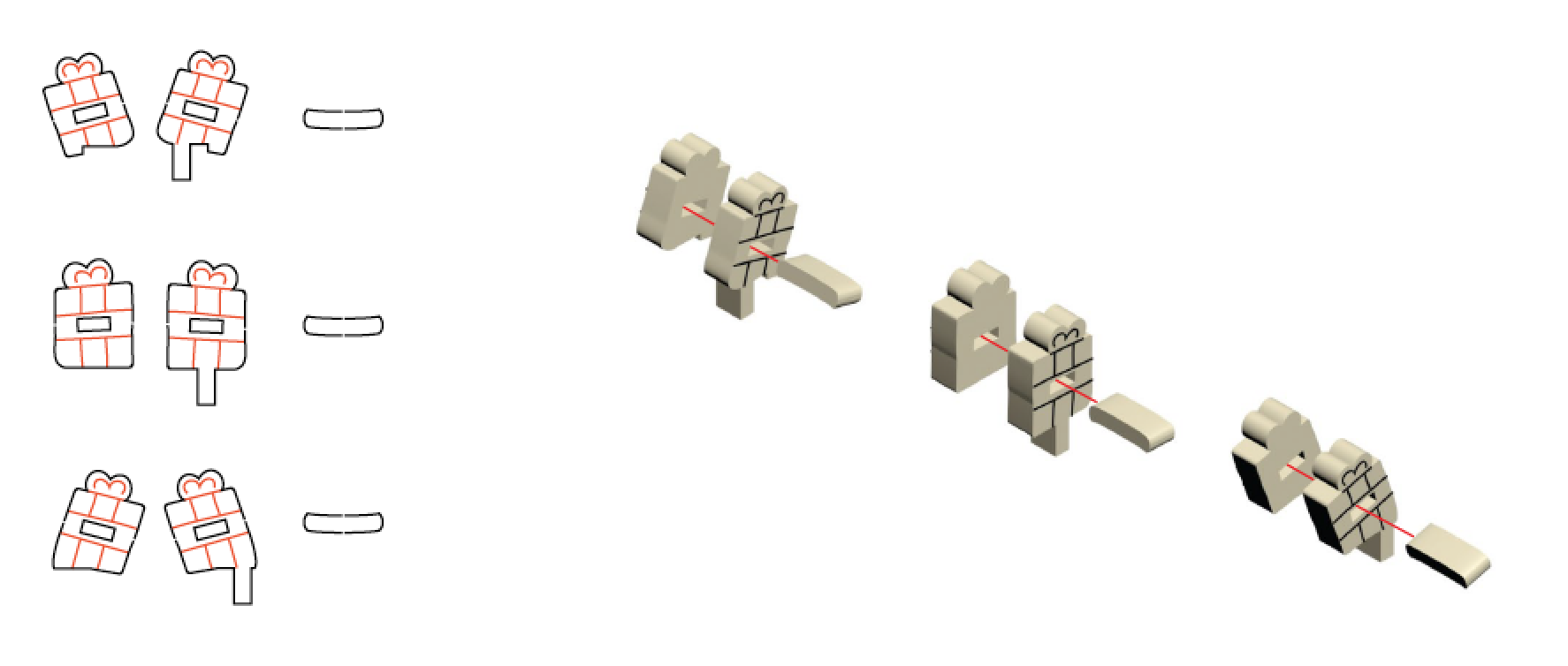 Monta i tre regali. Per distinguere i pezzi, guarda il profilo della base: piatto, curvo o con lo scalino